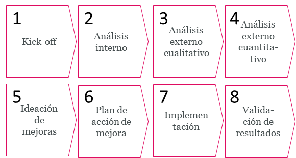 Aunque es cierto que cada empresa y, por tanto proyecto, es diferente, a grandes rasgos, un proyecto para mejorar la experiencia del cliente se estructura en las siguientes fases: