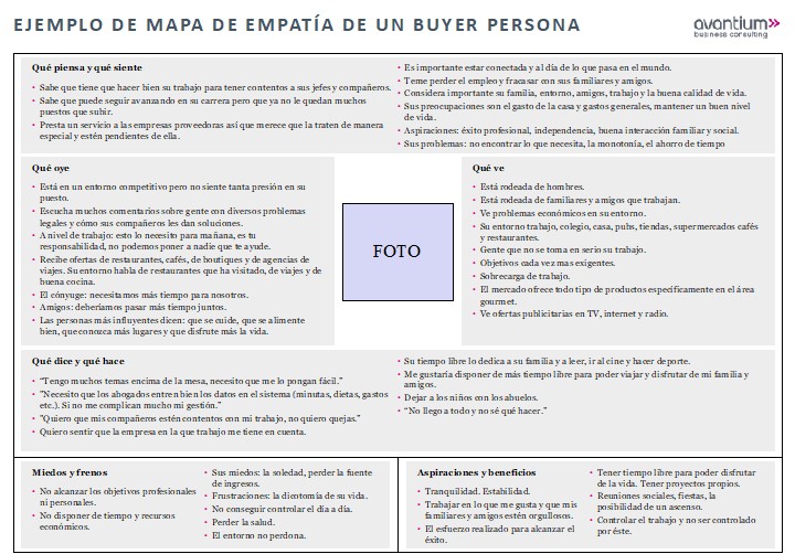 El mapa de empatía es una herramienta que busca describir a un segmento de cliente representado por una persona o buyer persona a través del análisis de 6 aspectos relacionados con los sentimientos del ser humano. Puede ser realizado a partir de preguntas que ayudan a entender a conocer el cliente y cómo relacionarse con él. Lo más habitual es obtener esta información a través de focus groups y completado con estudios cuantitativos.